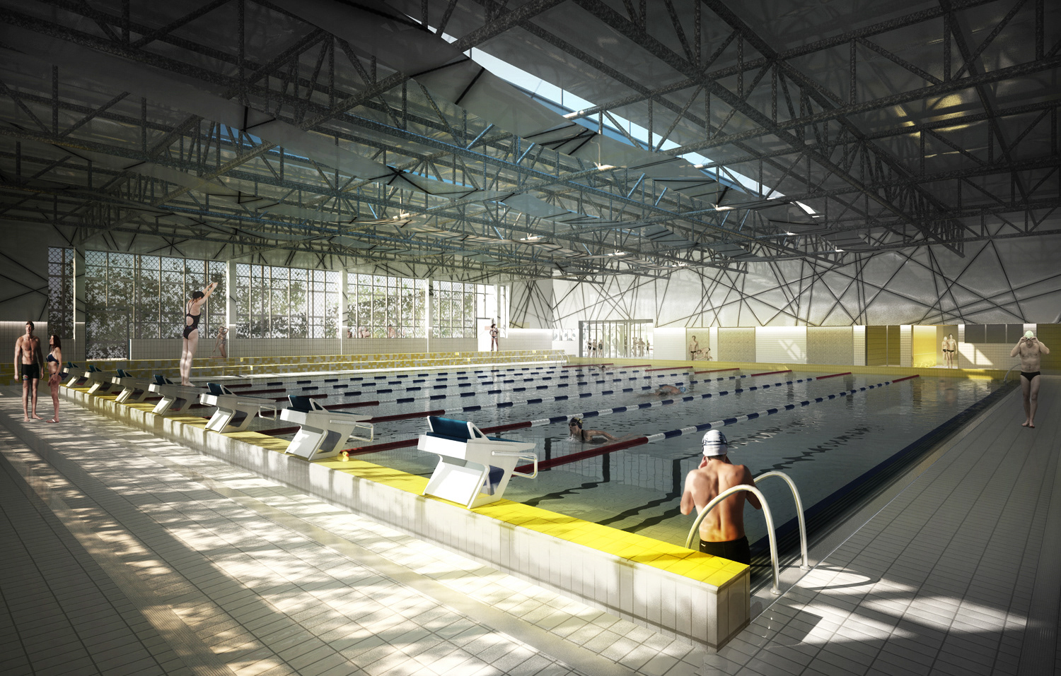 Perspectives du concours conception construction de la réhabilitation et de l'extension de la piscine Jean Pommier, Valence, France